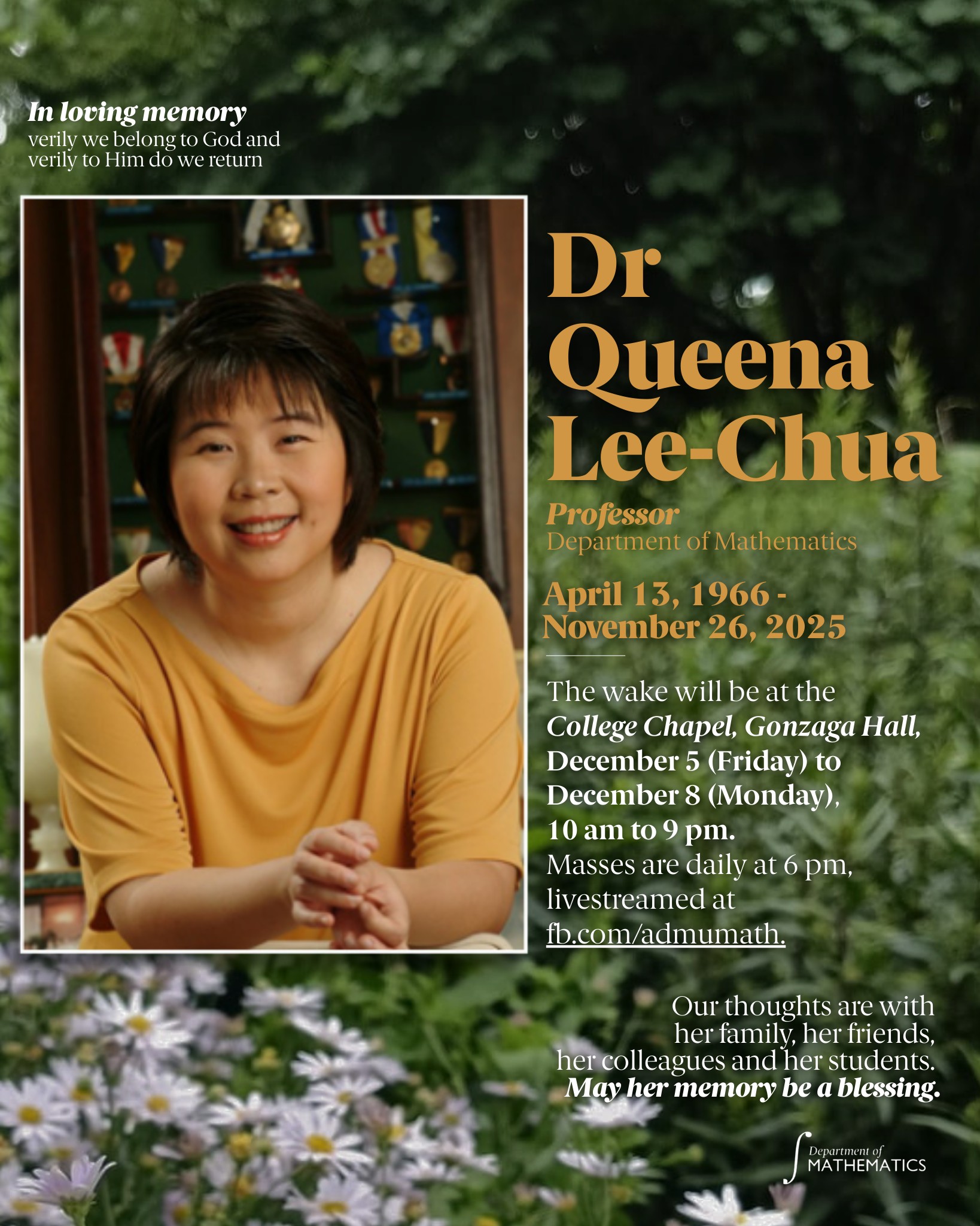 The Department of Mathematics invites the university community to join us in praying for the repose of the soul of