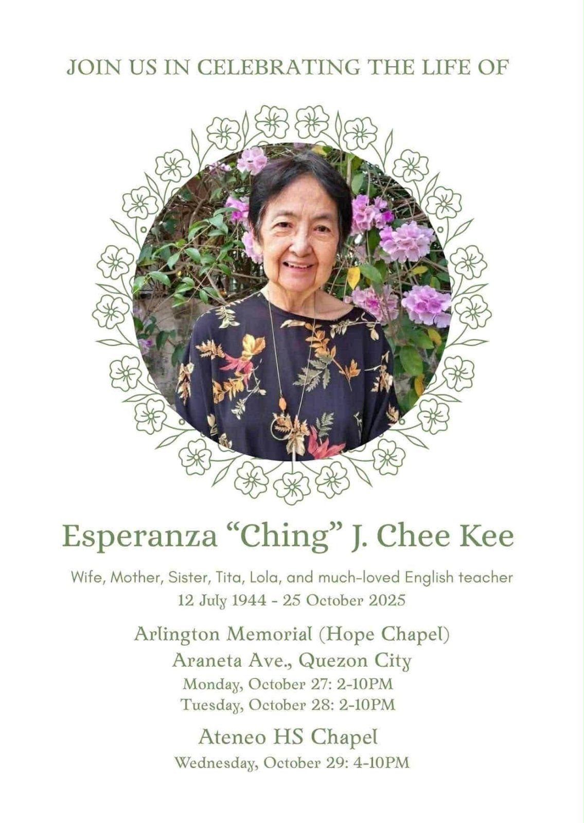With deep sadness, the Ateneo de Manila High School community mourns the passing of Mrs Esperanza “Ching” J Chee Kee on 25 October 2025, at the age of 81.