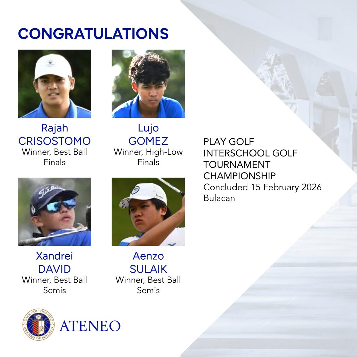 Composed of student-athletes from all three Ateneo de Manila Basic Education schools—the Grade School (AGS), Junior High School (AJHS), and Senior High School (ASHS)—Team Ateneo de Manila completed a remarkable campaign by winning the SY 2025–2026 Play Golf Interschool Golf Tournament Championship. The Blue Eagles captured the Match Play Round title in a knockout battle among the top eight schools, adding it to their earlier triumph in the Stroke Play Championship. The 16-man roster of the Ateneo Selection Team was comprised of EC Aguirre (5-Maguindanao), Rupert Cariño (2-Dao), Matteo dela Cruz (4-Magat Salamat), Luis Espinosa (6-Xavier), Marco Iglesia (4-Humabon), and Datu Villamor (2-Acacia) from AGS; Rajah Crisostomo (10-Pongracz), Juanton Cruz (8-Collins), Xandrei David (9-Isore), Iñigo Gallardo (8-Dajani), Lujo Gomez (8-Fujishima), Race Manhit (7-Alvares), and Aenzo Sulaik (10-Spinola) from AJHS; James Carlos (11-Mayer), Ty Go (11-Tsuji), and Milo Pastor (11-Campion) from ASHS.