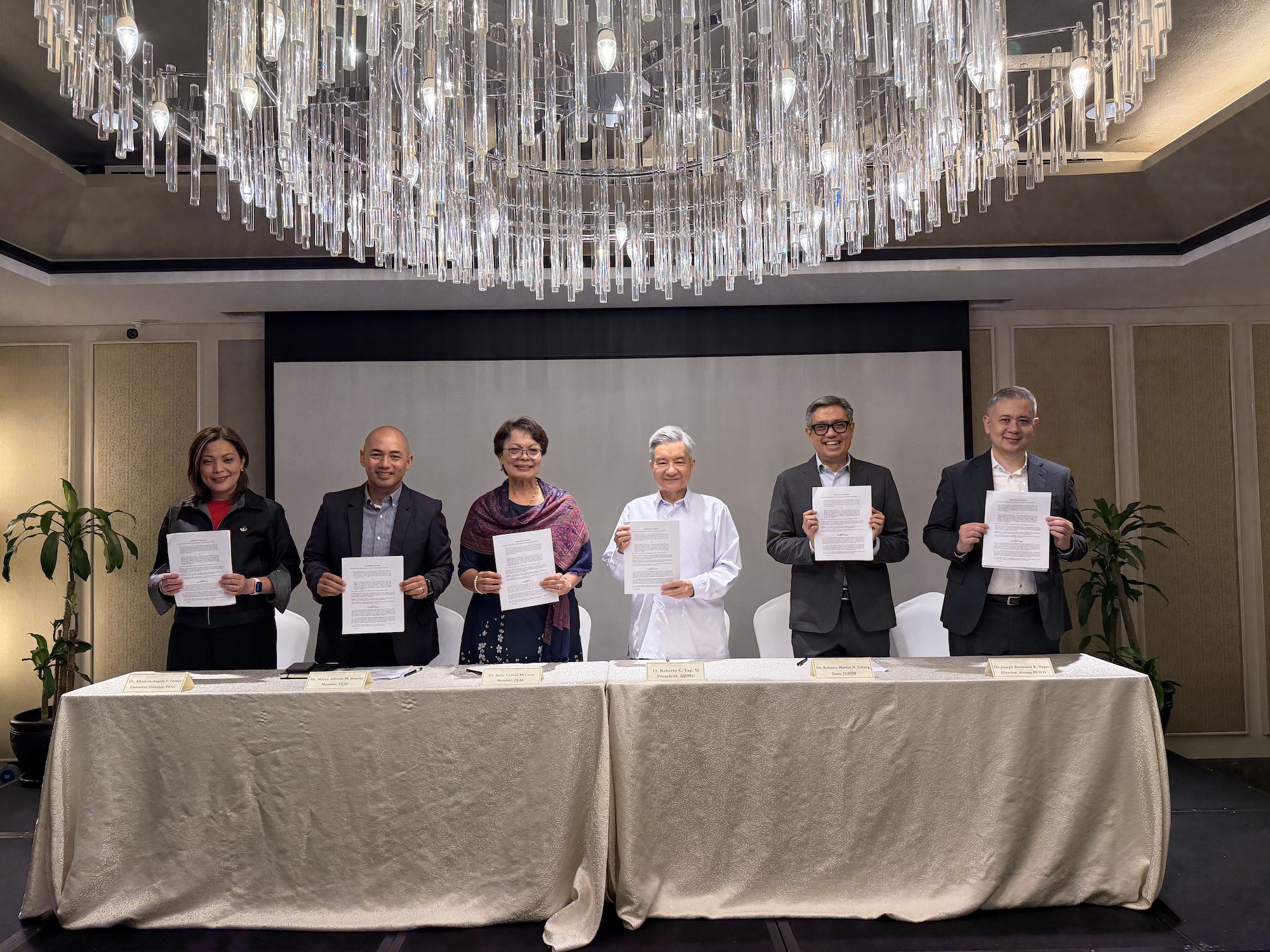 The partnership was formalized through a Master Agreement signed on 20 February 2026, at the Makati Diamond Residences, during the Regional Program Committee (RPCom) Assembly. The ceremony was attended by PEAC Executive Director Dr Rhodora Angela Fernandez Ferrer, PEAC Members Mr Marco Alfredo M Benitez and Dr Betty C McCann, Ateneo de Manila University President Fr Roberto C Yap SJ, JGSOM Dean Dr Roberto Martin N. Galang, BUILD Director Mr Joseph Benjamin R Ilagan and representatives from the PEAC National and Regional Secretariats and the Department of Education.