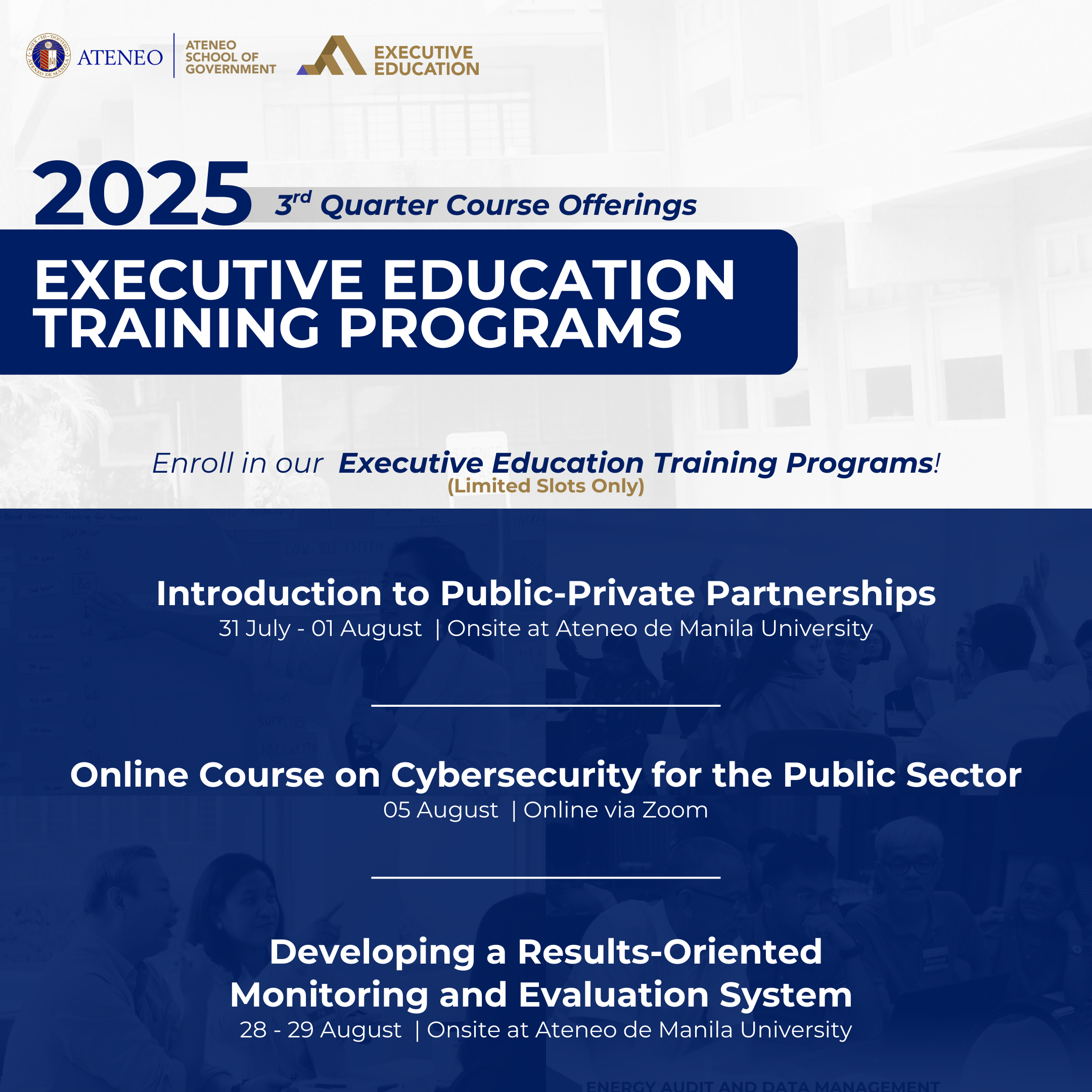 Strengthen your leadership and technical skills through our Executive Education Program’s 3rd quarter course offerings! Designed for public sector professionals, our courses provide practical tools and strategies, and expert insights for more effective and future-ready governance. Join us in advancing public service through continuous learning and capacity building.
