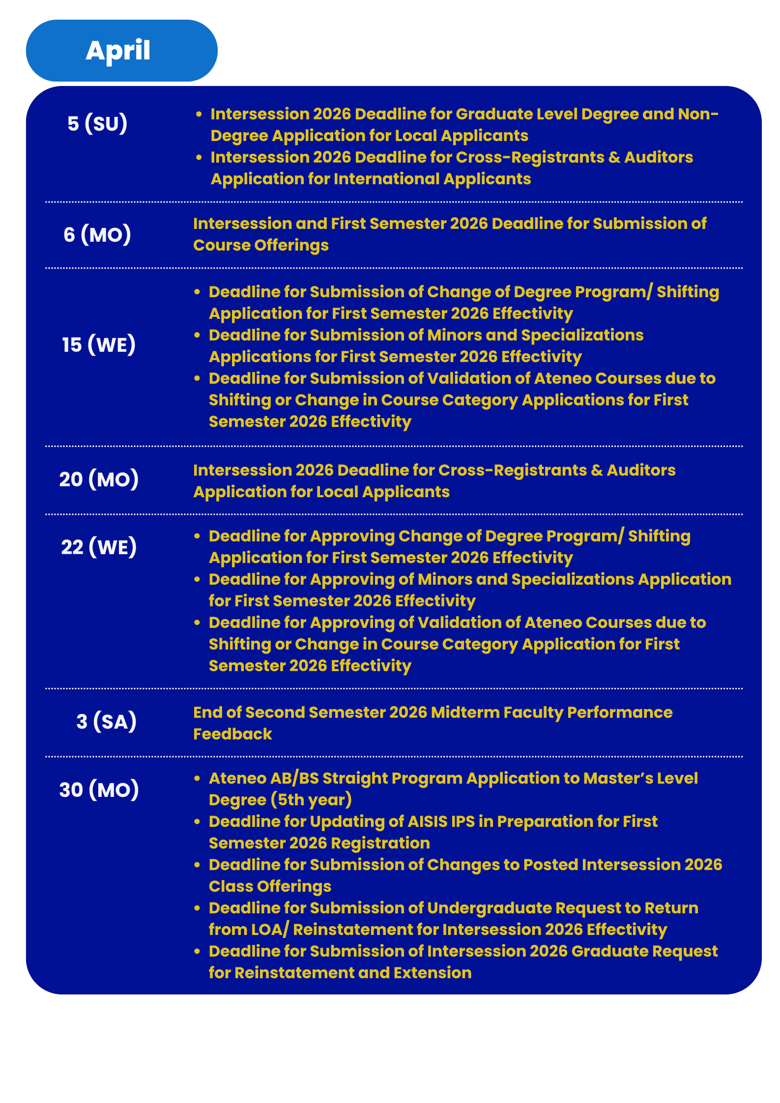 | Approval of Thesis, Dissertation, and Capstone Project up to the Deans (for Graduate Students) | Last day of the term: 16 May 2026 |