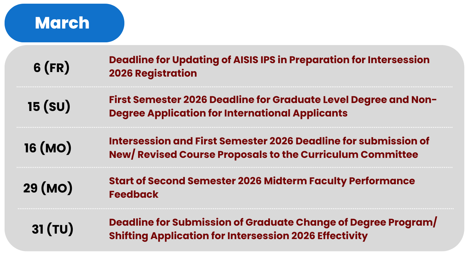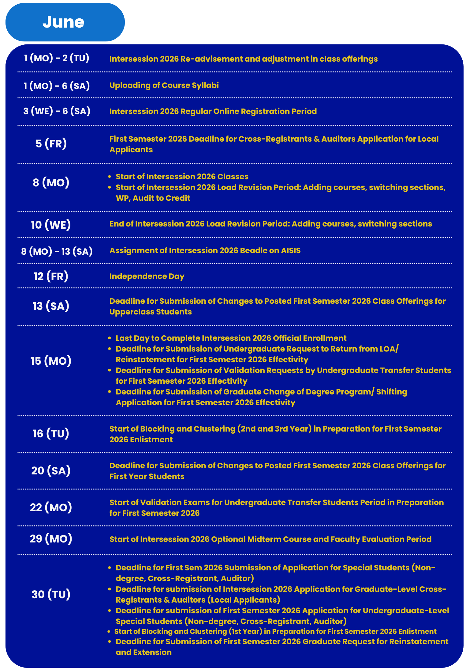 | Online Release of Advisory Grades on AISIS (for First Year Students & Transferees only) | 14 March 2026 |