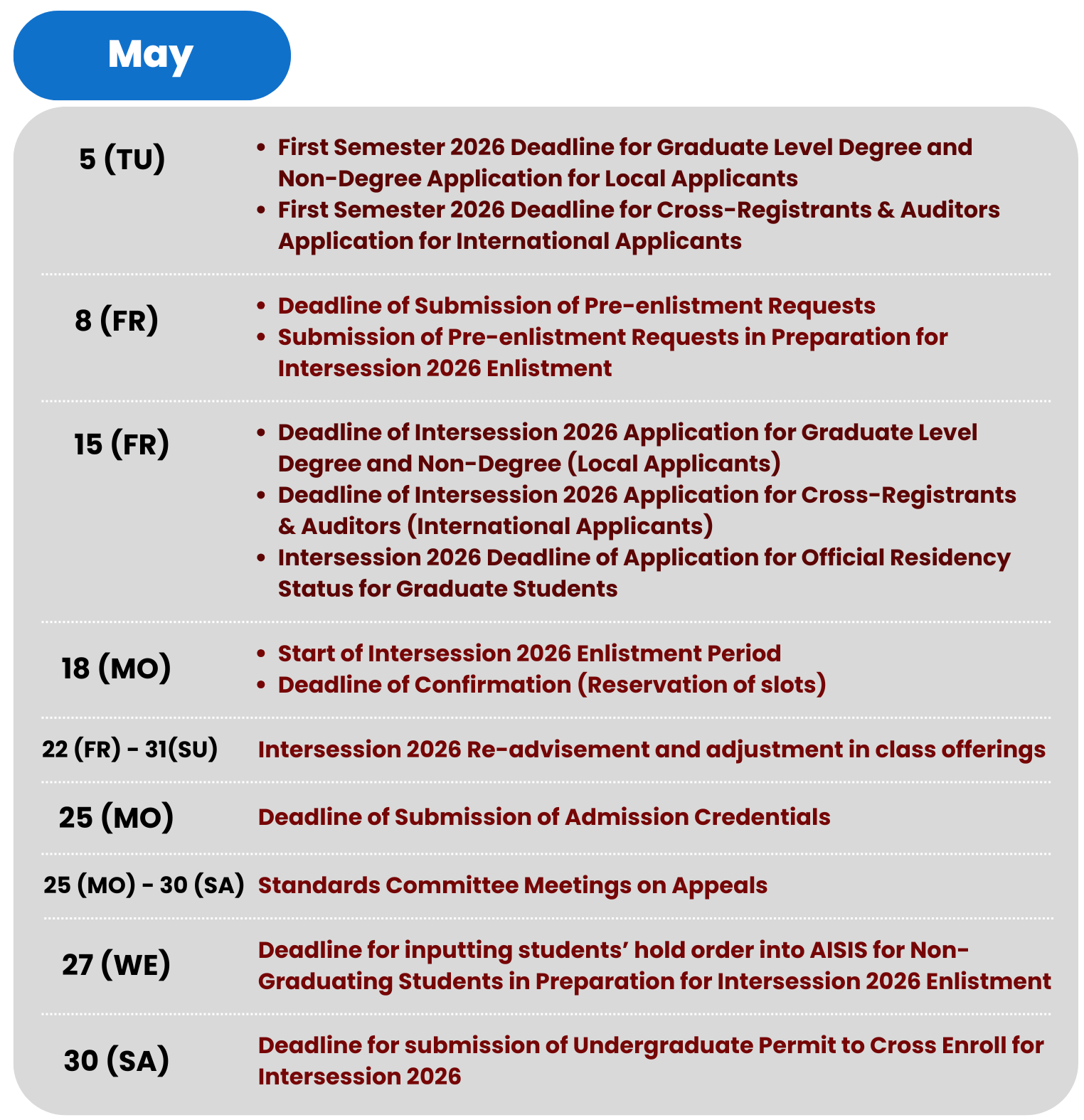 | Final Oral Defense Deadline (for Graduate Students) | 16 May 2026 |